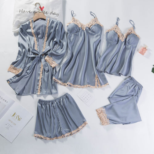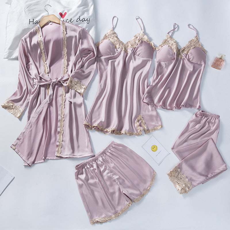 Spring Women's Summer Ice Silk Pajamas Five-piece Set